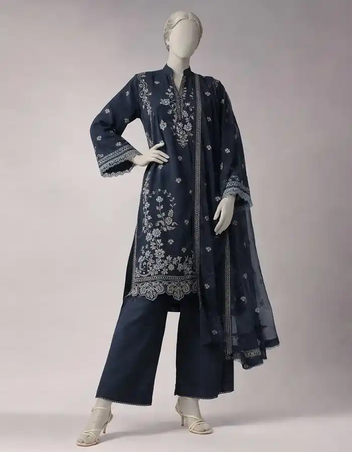 3-piece navy blue unstitched 3pc suit Rs:7,490.