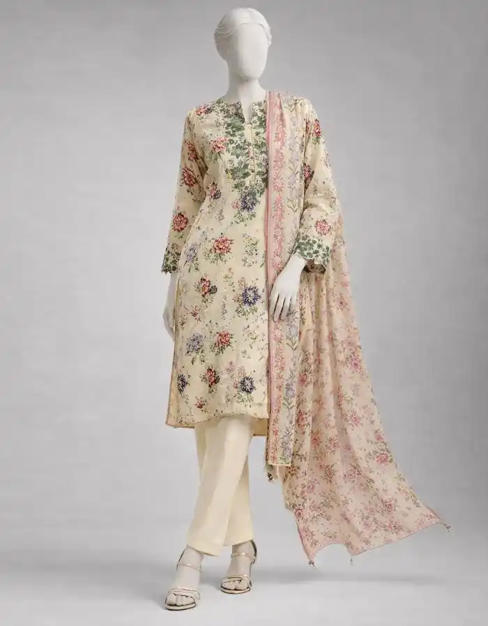 Off-white color three-piece unstitched suit PKR:4,590 only.