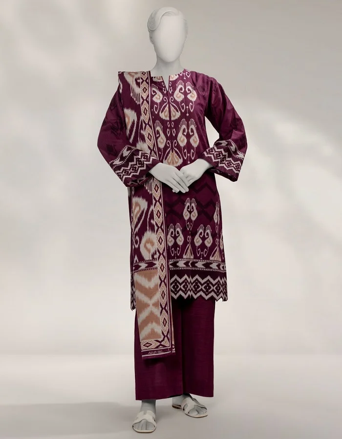 Let’s refresh your winter wardrobe by wearing this magenta jacquard unstitched 3-piece suit Rs:7290 Rs:5832.