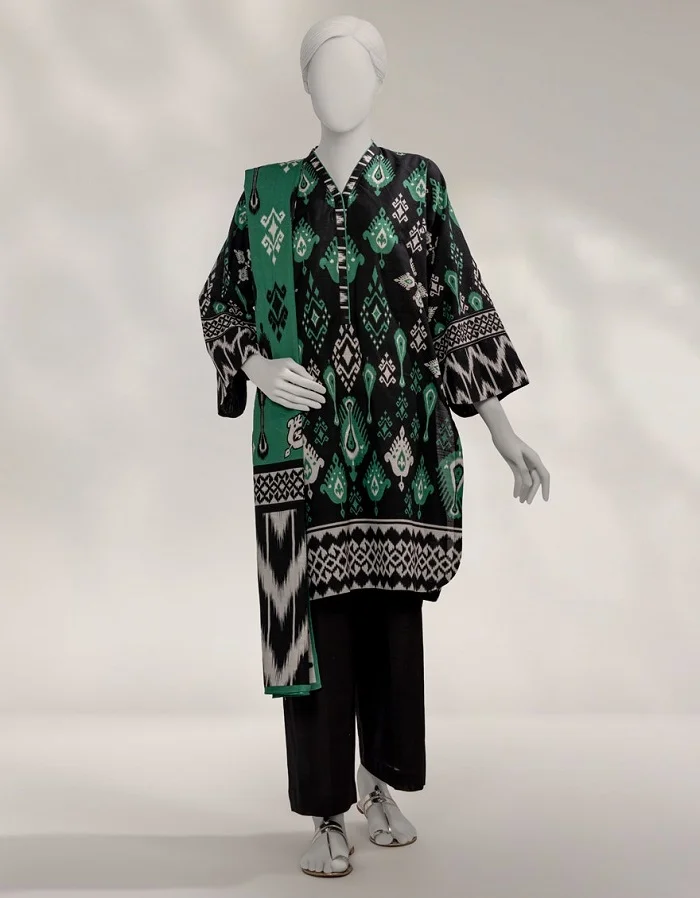 Green linen printed 3 pc stitched suit Rs:8,290.