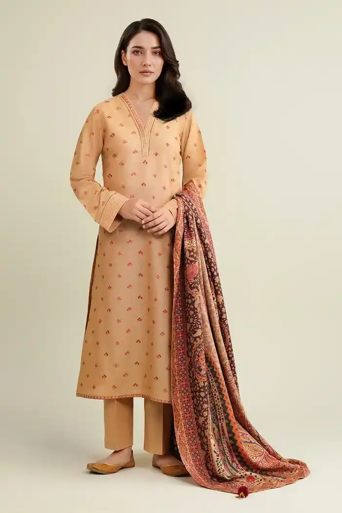 Beige color winter khaddar 3 piece embroidered suit Rs:9,990 Rs:6,993.