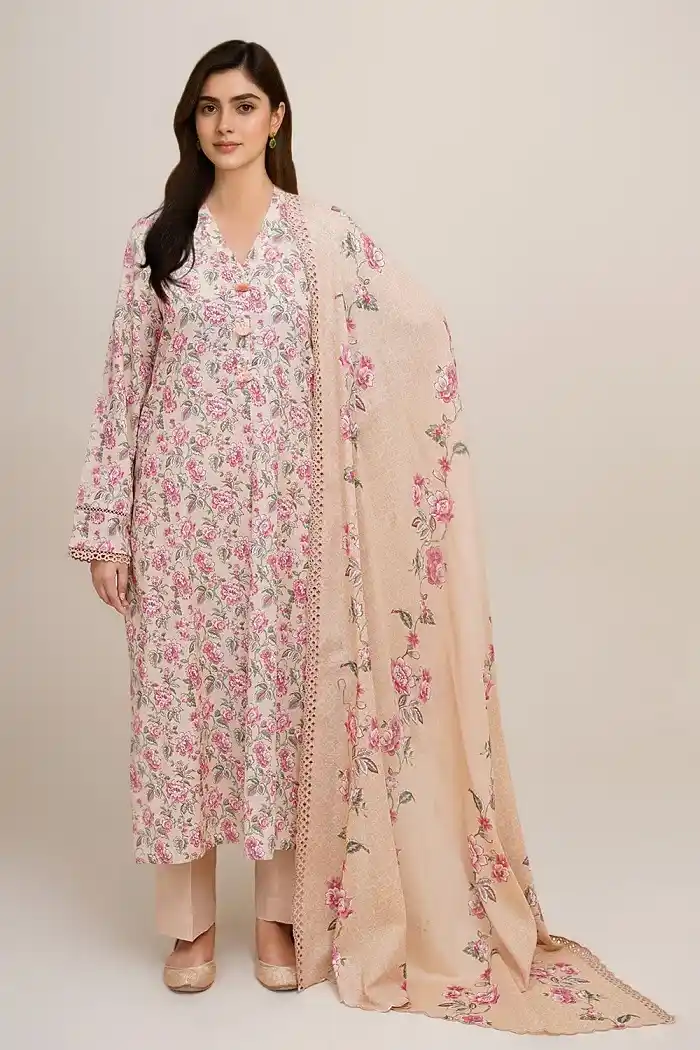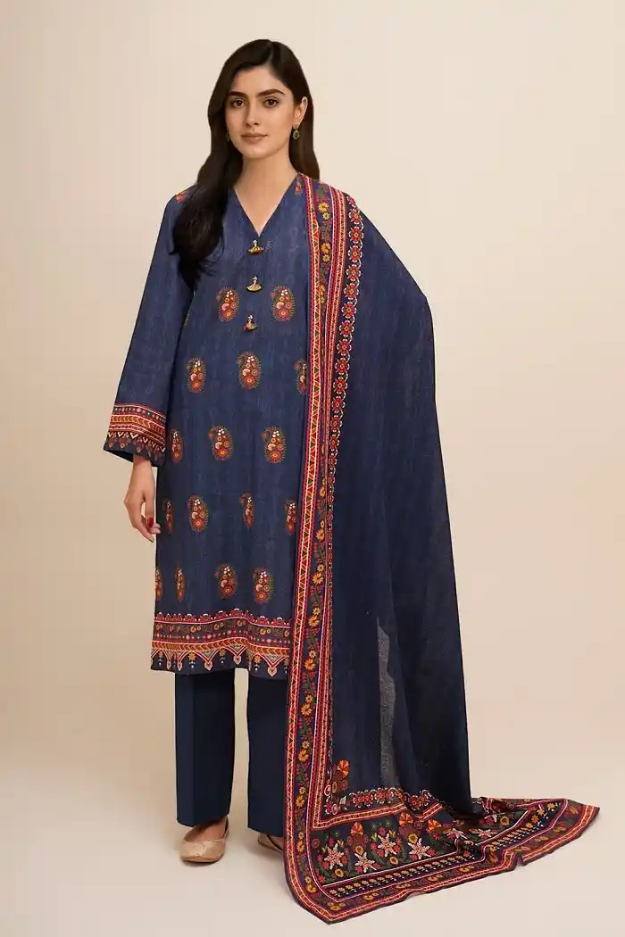 3-piece digital printed khaddar unstitched suit Rs:5,990 Rs:4,793 only.