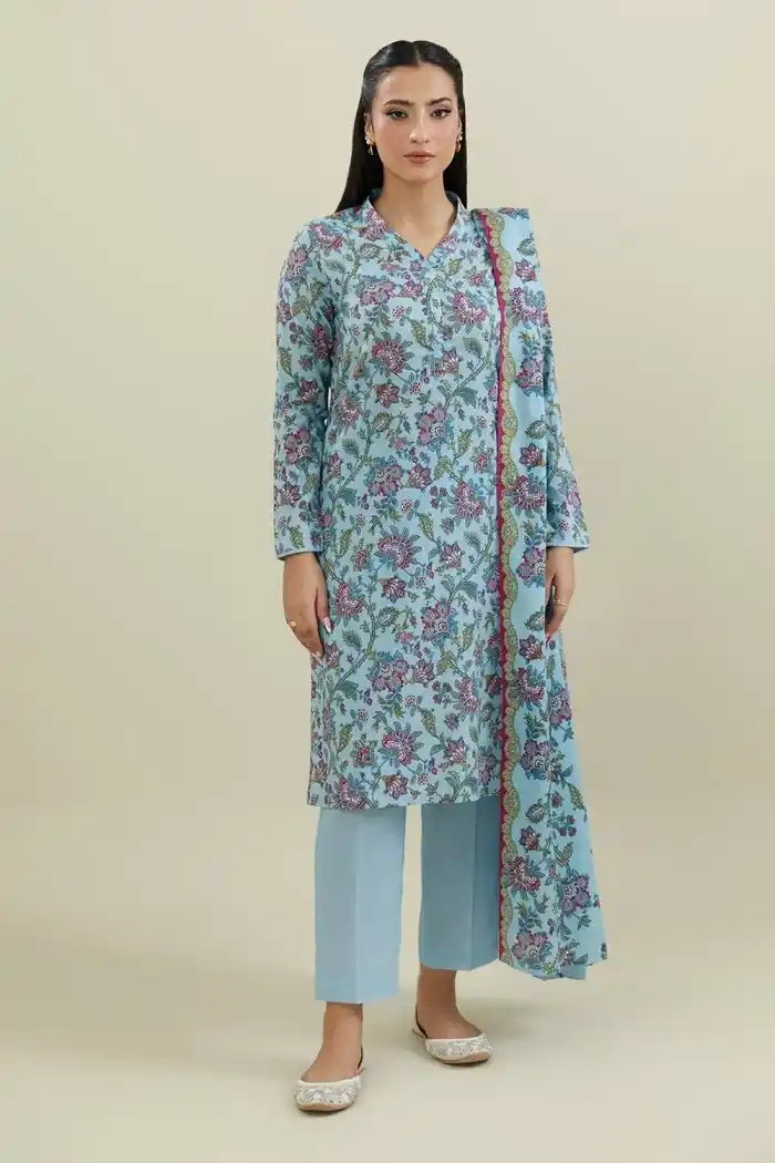 Light Blue color 3piece printed khaddar embroidered suit Rs:7,490 Rs:5,992 only.