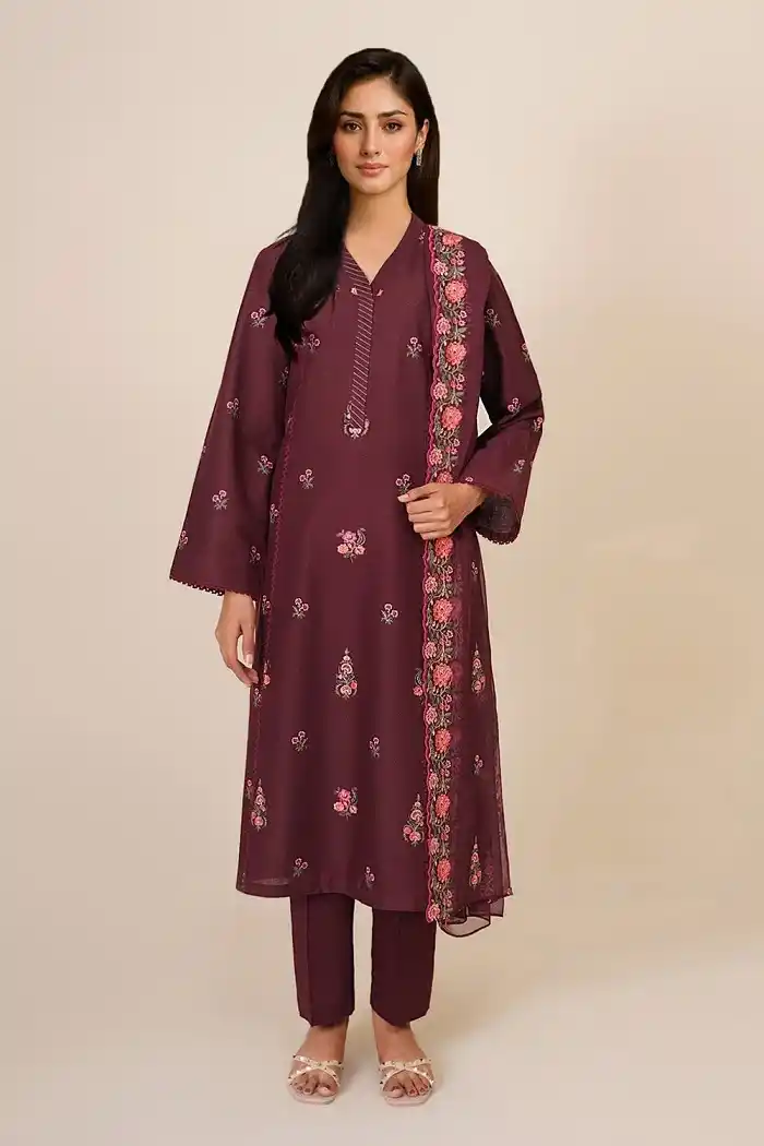 Maroon khaddar embroidered 3 piece suit Rs:9,690 Rs:6,783 only.