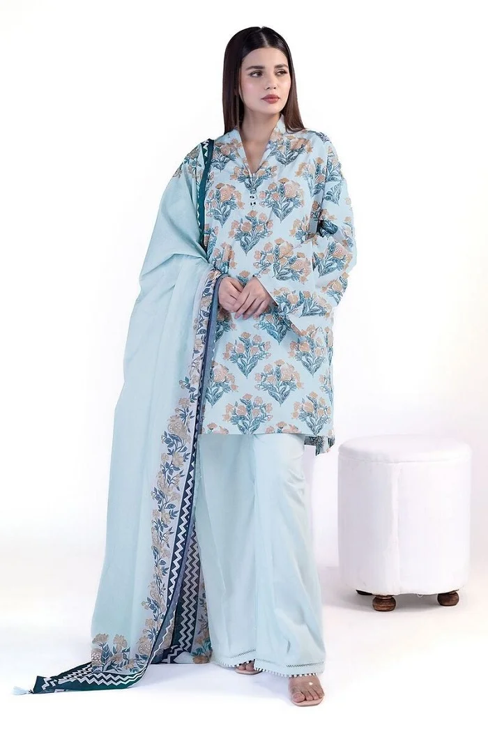 Sky blue color digital printed embroidered lawn 3-piece suit Rs:5,000 Rs:3,750 only.