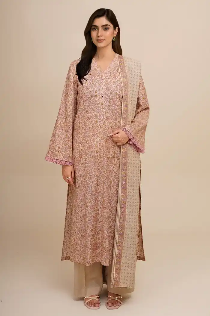 Khaddar three-piece beige color suit available for Rs:3,990 only.