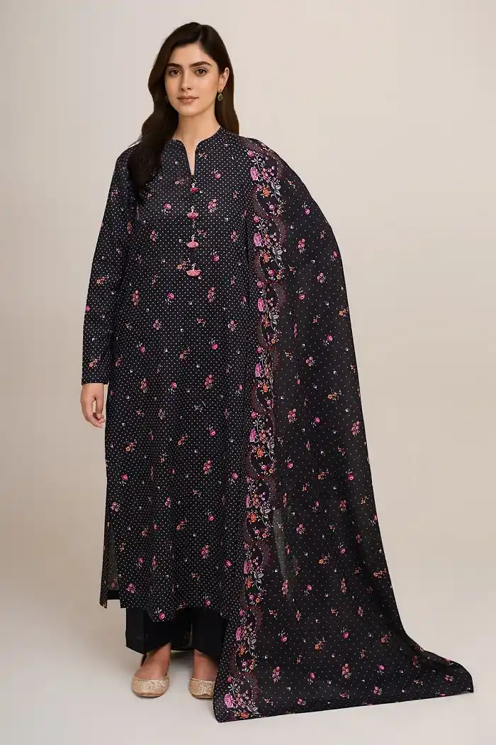 Beautiful black color floral printed khaddar shirt, dupatta, and shalwar available for Rs:3,990Â only.