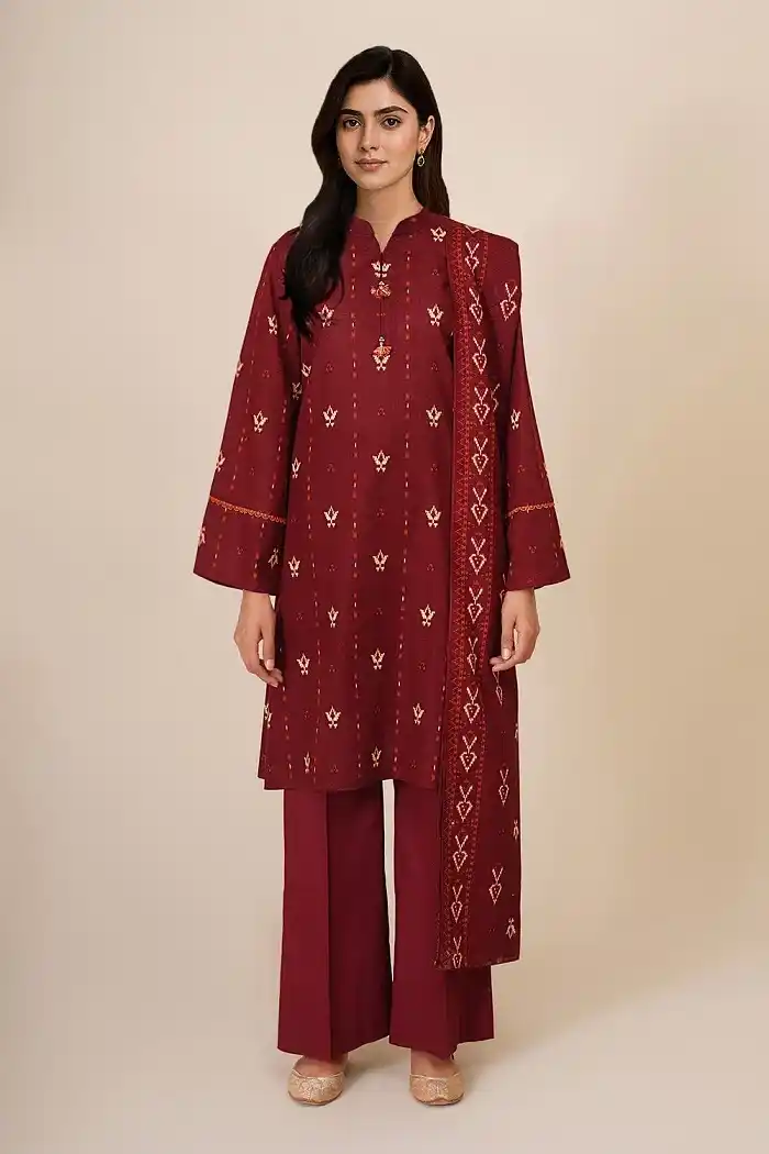 3piece unstitched winter khaddar maroon color suit with wool shawl for women PKR:10,890 only.