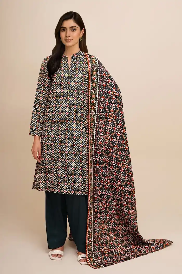 Stylish three-piece khaddar printed suit Rs:3,990 only.