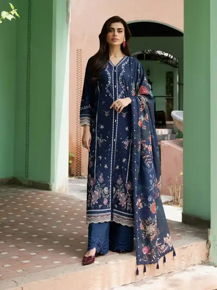 Navy blue khaddar digital printed 3-piece suit Rs:8,499.