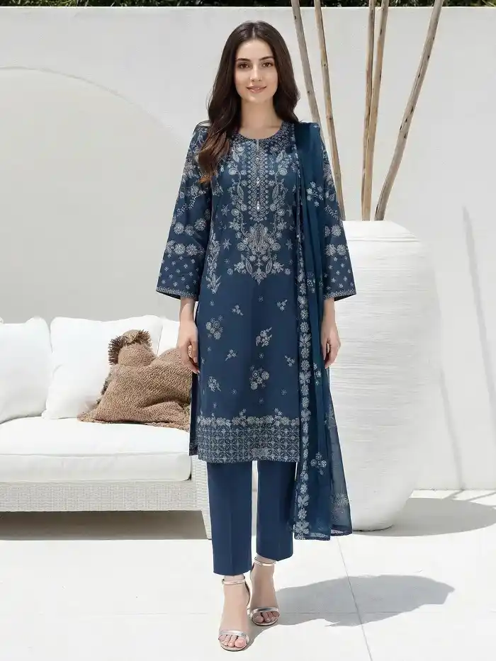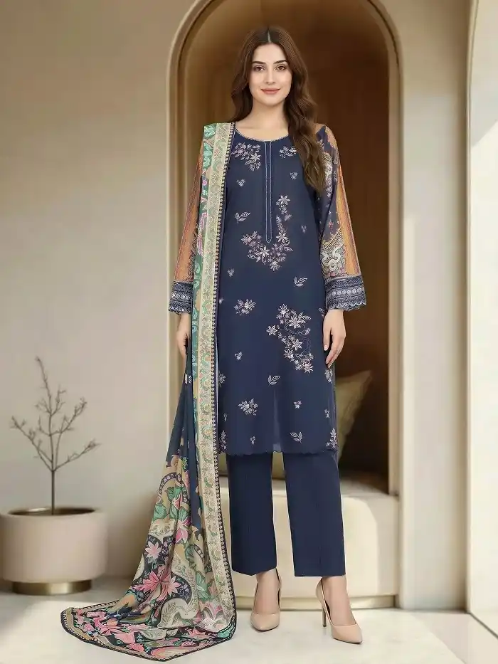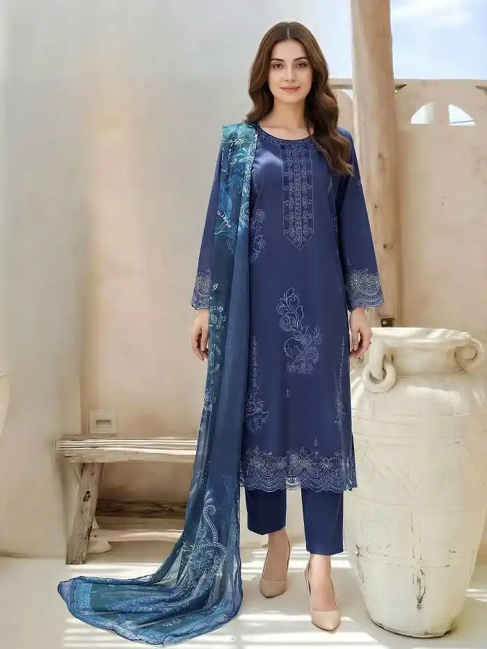 3-piece printed lawn unstitched blue color embroidered suit Rs:4,499 only.