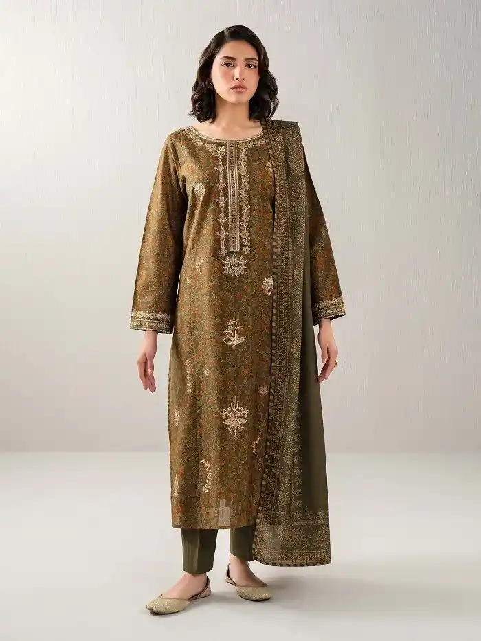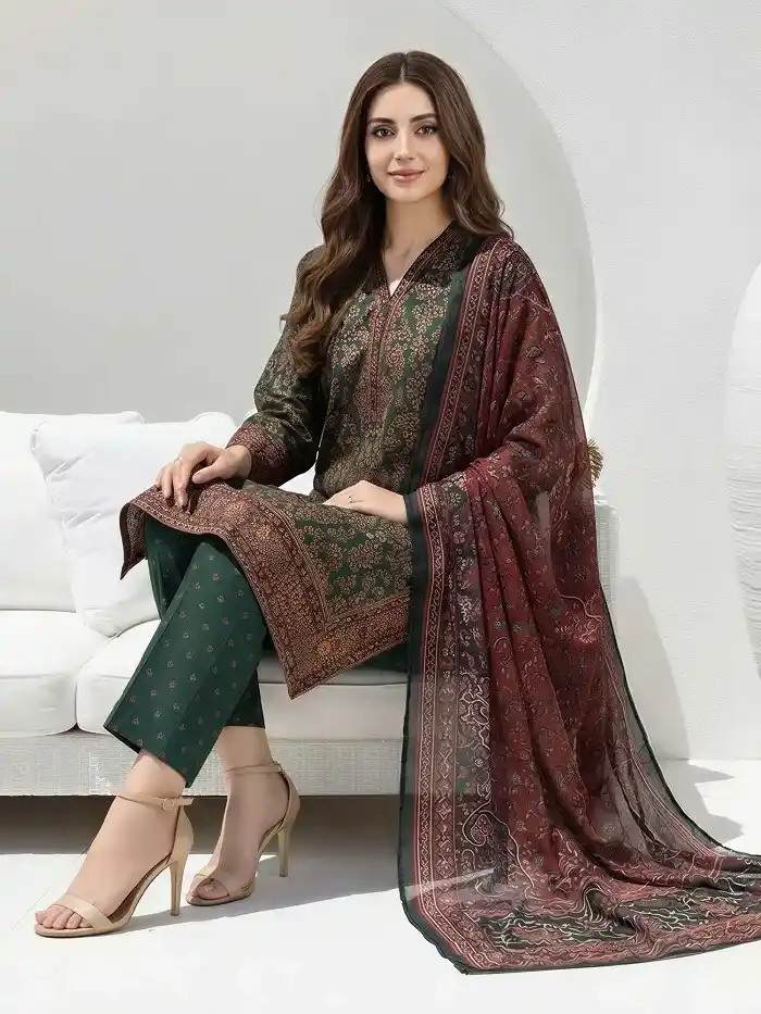 Lawn Three Piece Unstitched Embroidered Green color Suit Rs:3,199.
