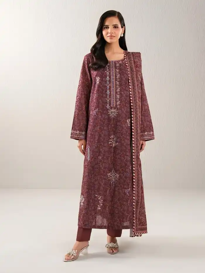 Floral printed maroon color 3 piece lawn embroidered unstitched suit Rs:4,899.