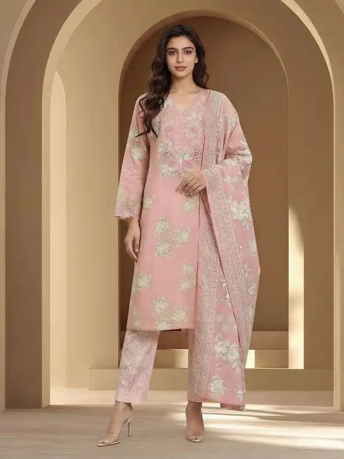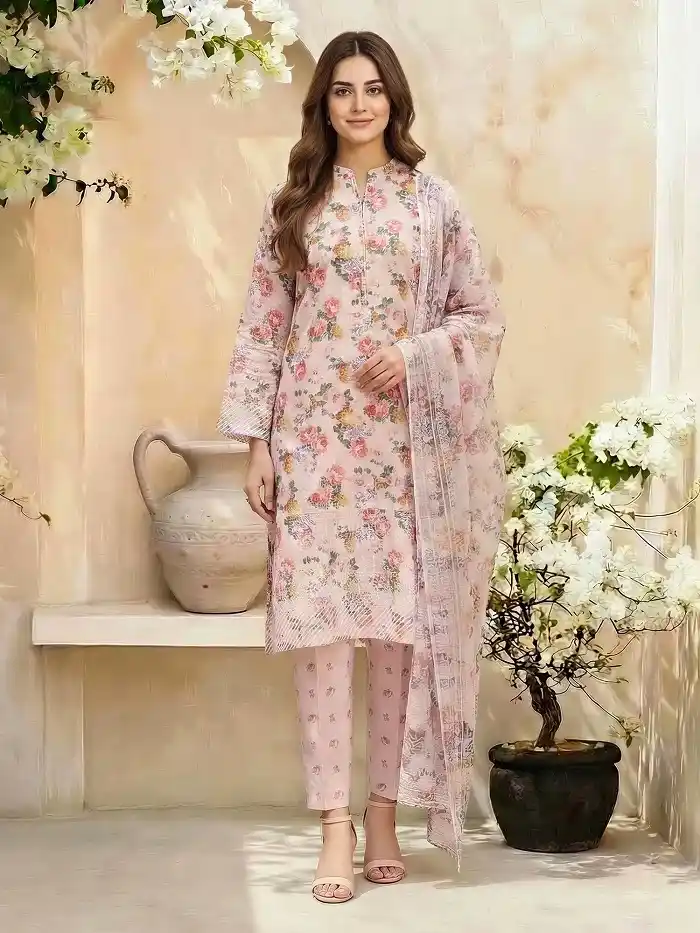 3-piece lawn unstitched pink color suit Rs:5,499 only.