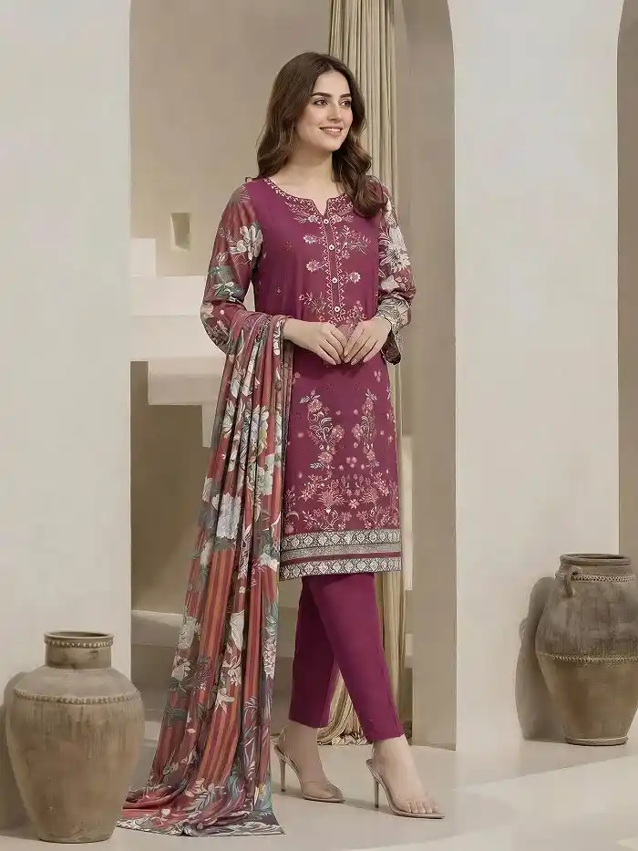 Ladies’ favorite maroon color unstitched printed lawn 2-piece suit for women PKR:1,599 only.