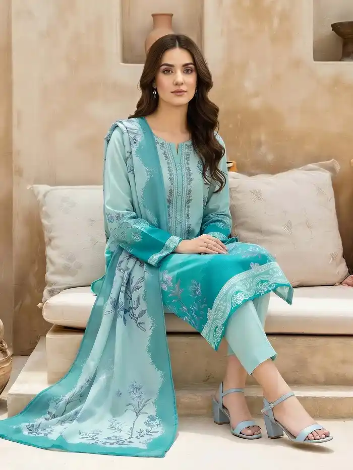 For a unique summer look wear this 3-piece printed lawn blue color suit available for PKR:3,499 only.