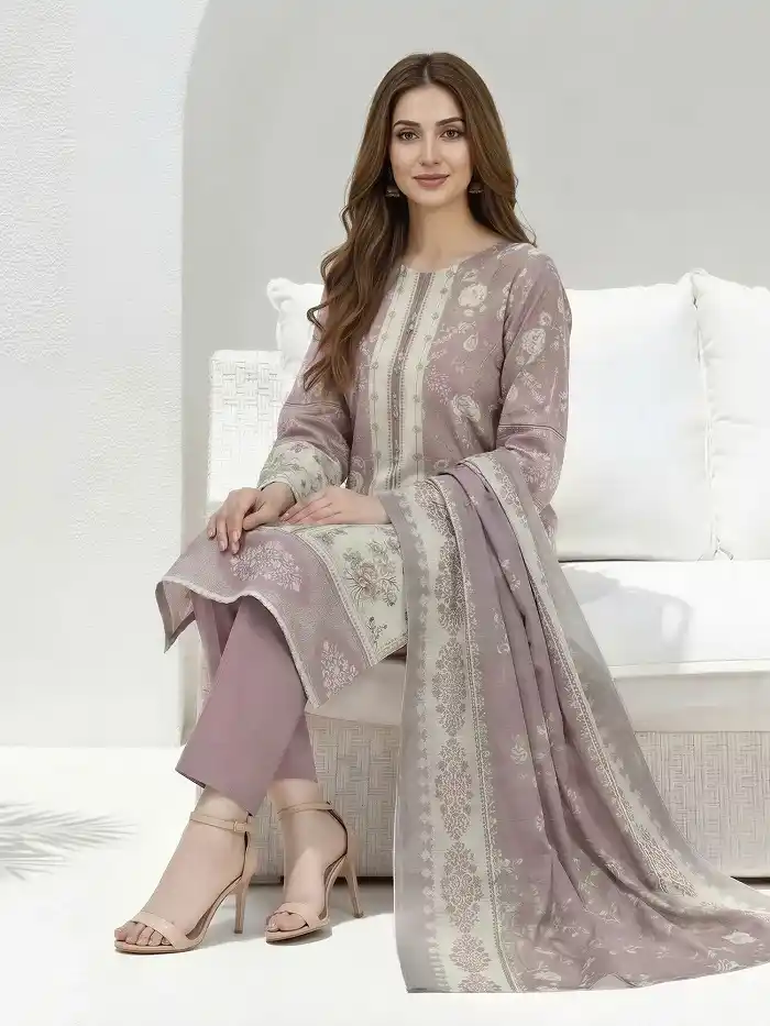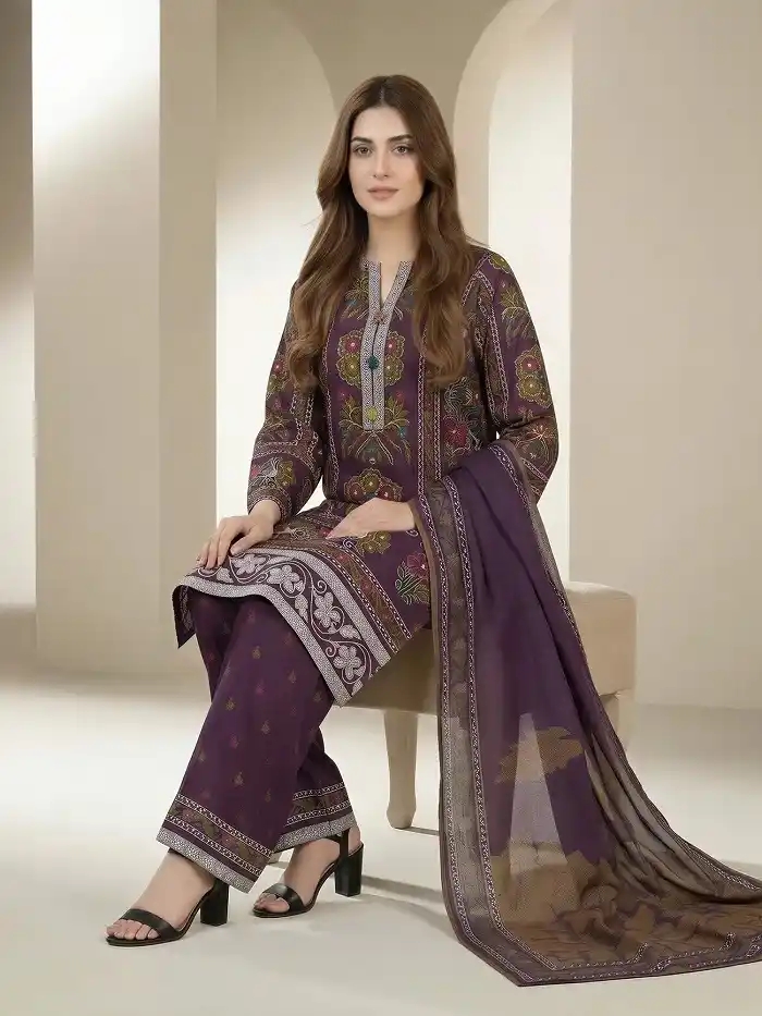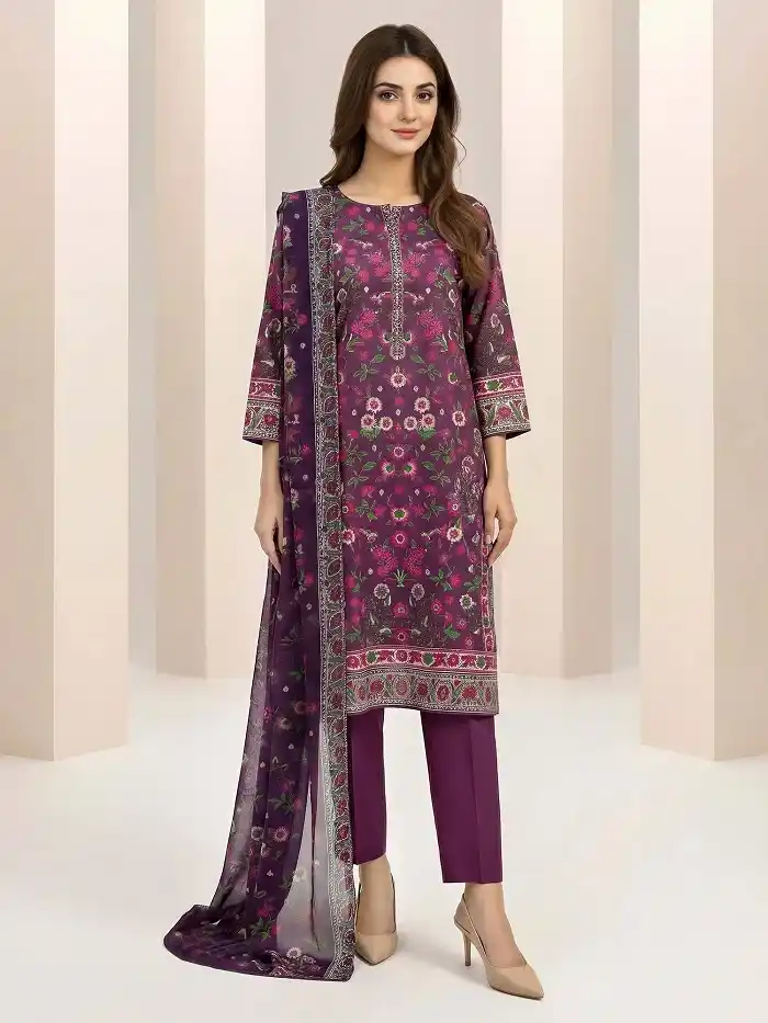 Stylish purple color 3-piece lawn unstitched suit Rs:3,899 only.