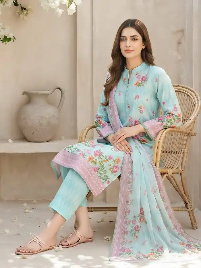 Ladies’ favorite sky blue color unstitched printed lawn 3-piece suit for women Rs:3,999 only.