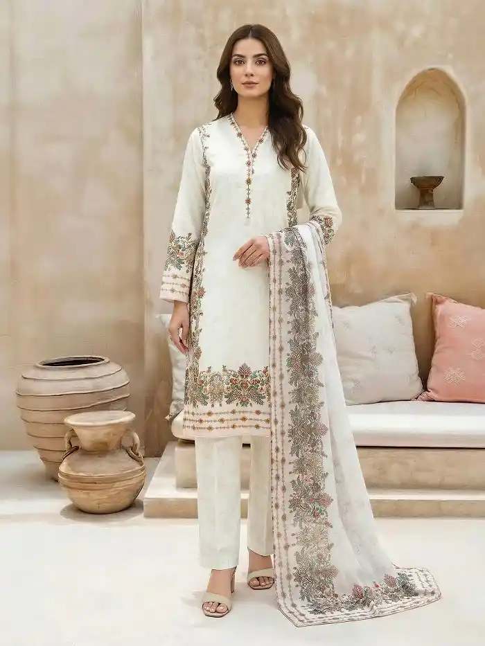 3pc printed lawn embroidered unstitched off-white color suit Rs:5,499.