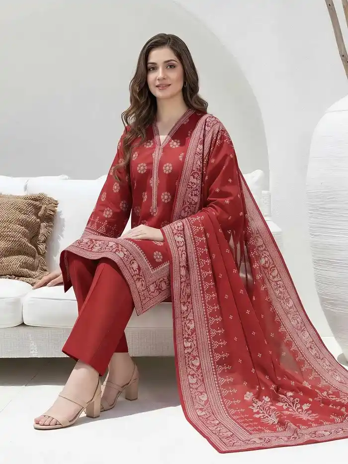 Red color lawn unstitched 3-piece suit Rs:3,899.