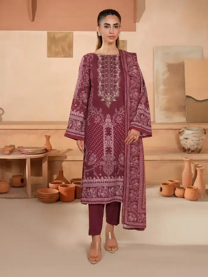Maroon 3piece khaddar unstitched printed suit Rs:6,999.