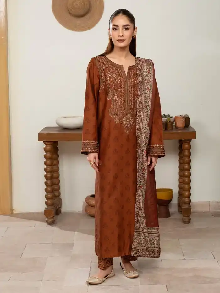 Stylish rust color winter khaddar 3 piece suit available for Rs:5,999 Rs:4,799.