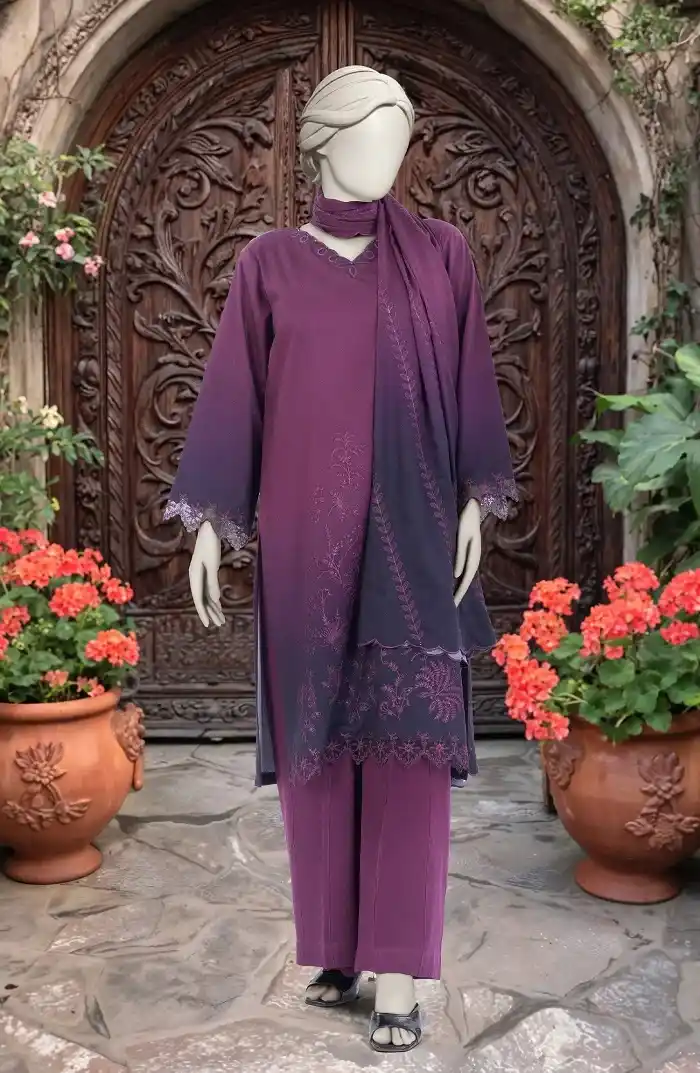 Winter’25 khaddar purple color unstitched 3 piece suit Rs:4,690 Rs:2,990 only.