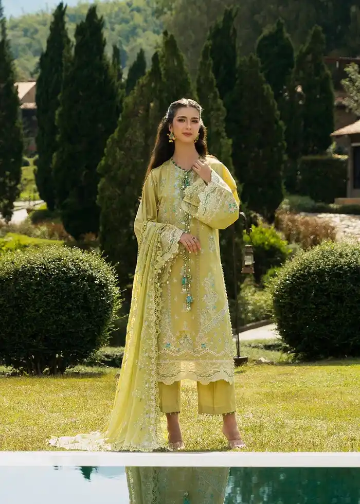 Three piece lawn embroidered yellow color suit Rs:9,990.