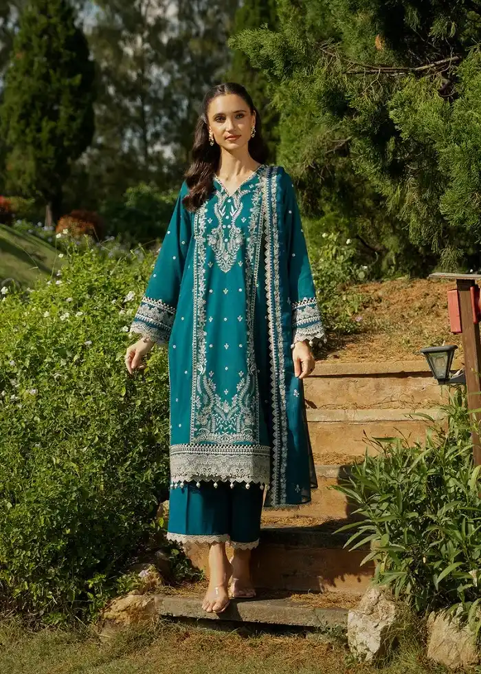 Unstitched lawn teal color 2-pcs embroidered suit for women Rs:4,990.
