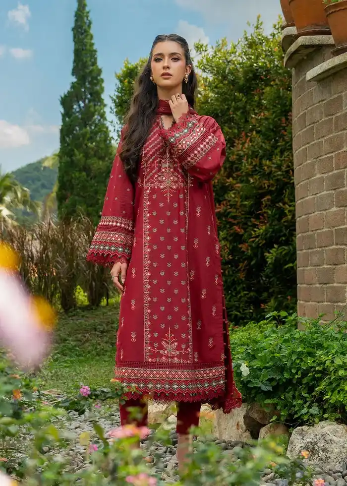 Maroon color 3pc lawn embroidered suit PKR:9,990.
