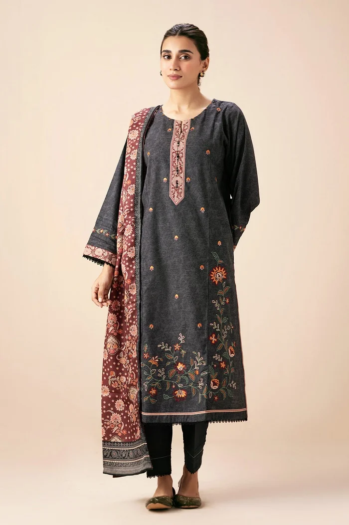 grey color embroidered unstitched 3 piece suit Rs:5,490 Rs:3,843 only.