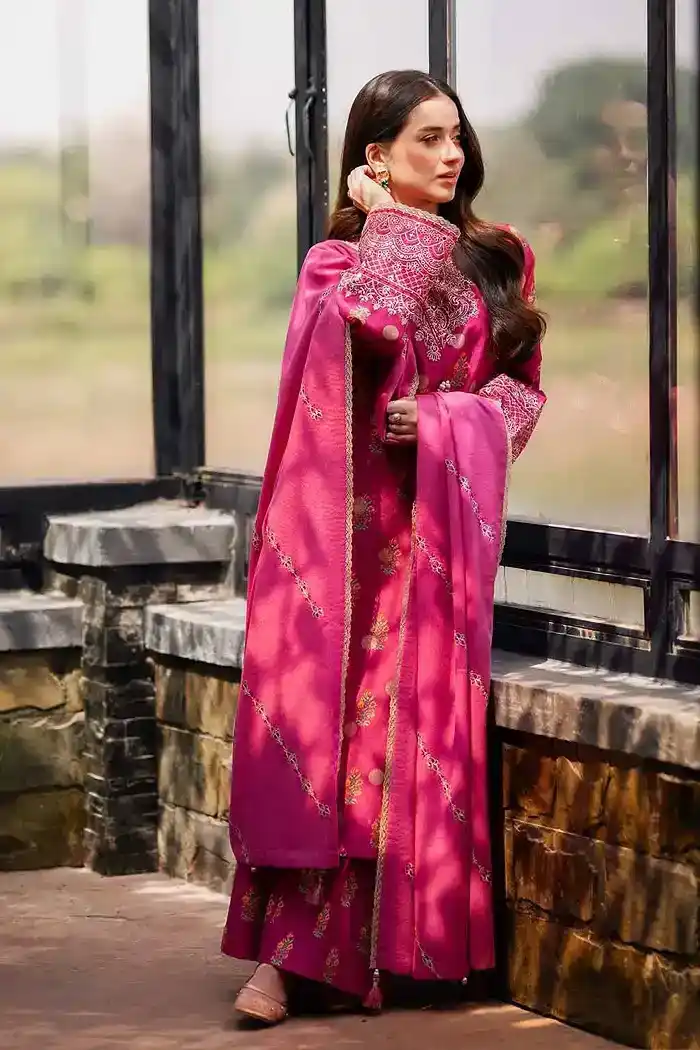 This winter makes a unique style statement by wearing this embroidered fuchsia suit Rs9,990.