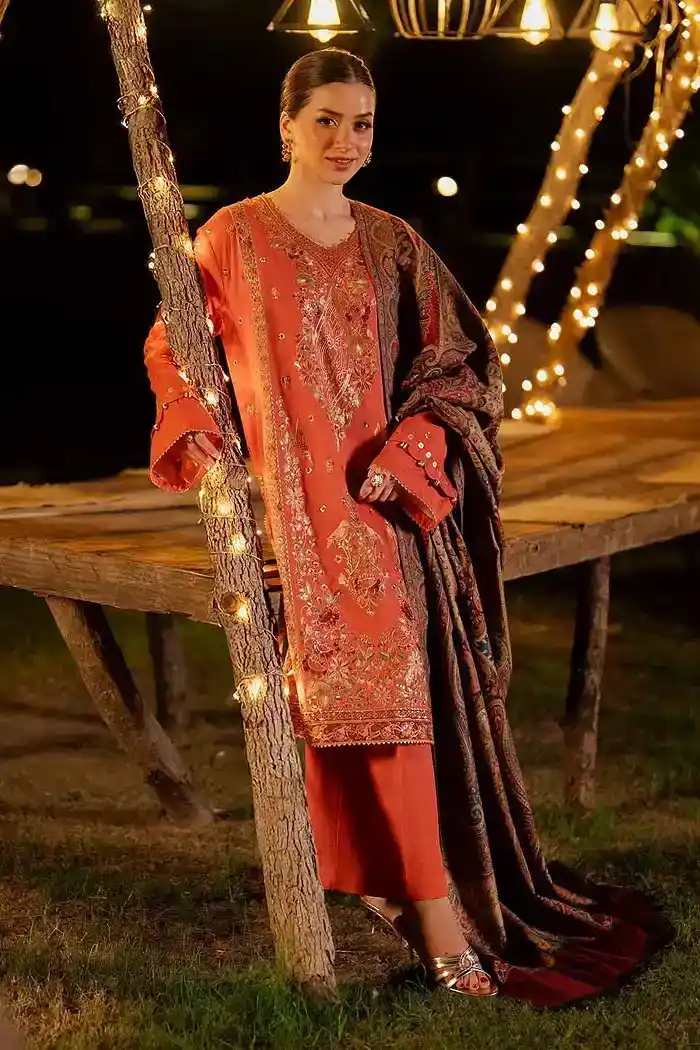 Let’s make your day magnificent by wearing this red color khaddar 3-piece unstitched suit PKR:3,690.