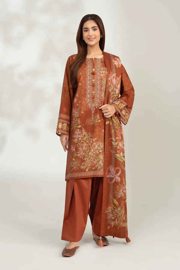 Printed embroidered 3pc dark rust brown cotton jacquard unstitched suit Rs:8,990.