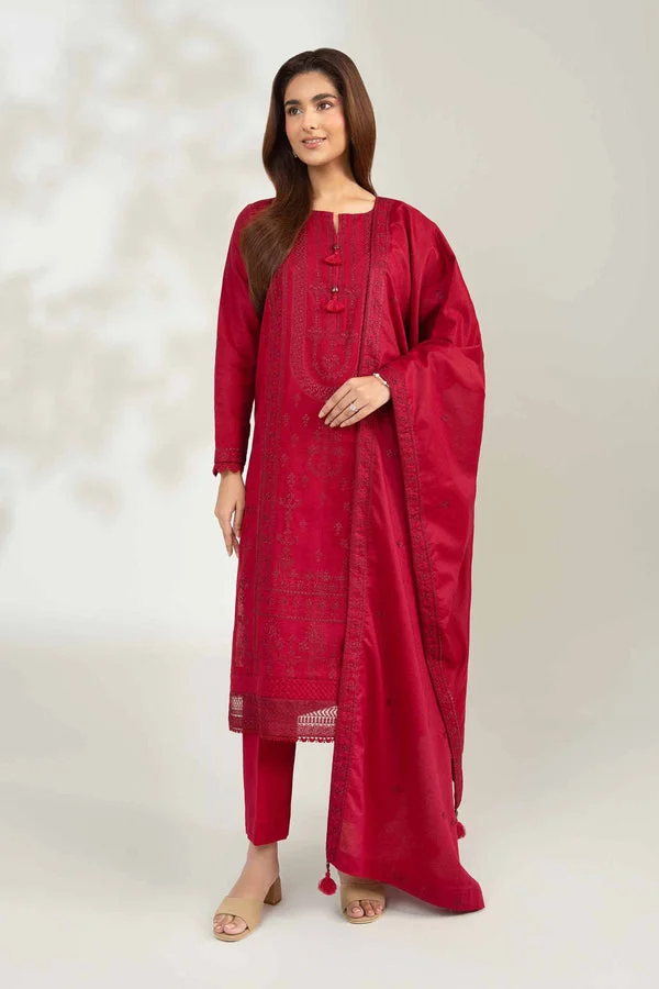 Let’s make your day magnificent by wearing this red color khaddar 3-piece unstitched suit PKR:3,690.