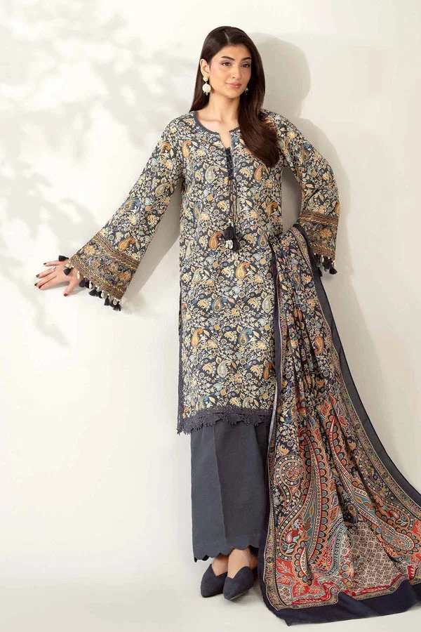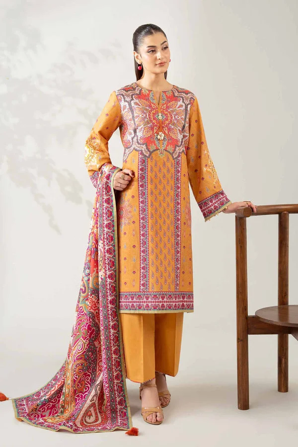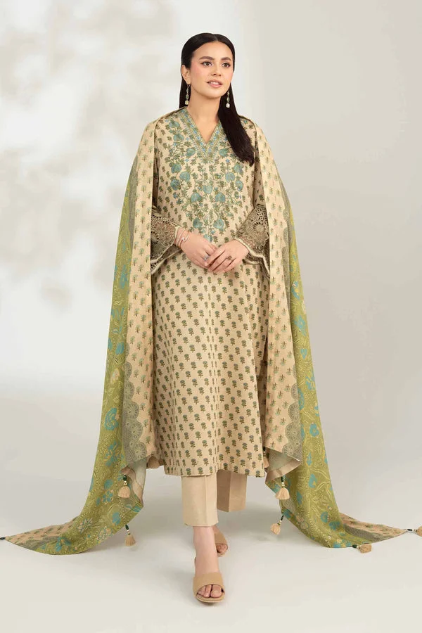 Update your winter wardrobe with this 3-piece printed khaddar gold color unstitched suit Rs:9,990 only.