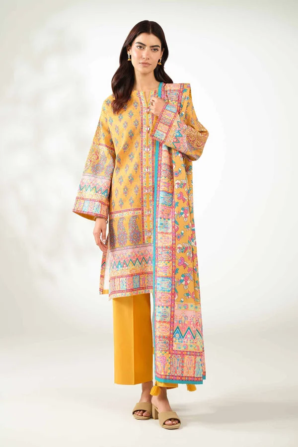 3-piece printed embroidered karandi yellow suit PKR:15,490.