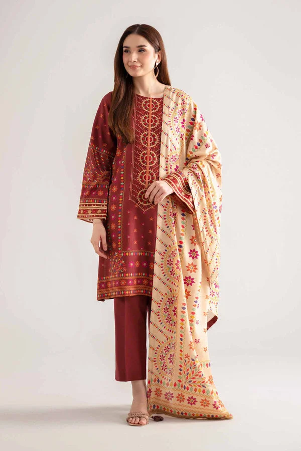 Get a fabulous look by wearing this maroon floral printed khaddar beige color PKR:9,990.
