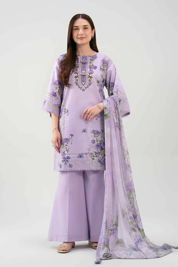 Every print is a masterpiece of confidence with digitally printed three piece summer collection lilac color suit Rs:5,990.