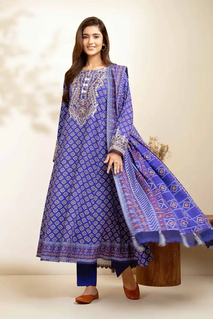 Three-piece blue color khaddar fabric Available now Rs 5,690 only.