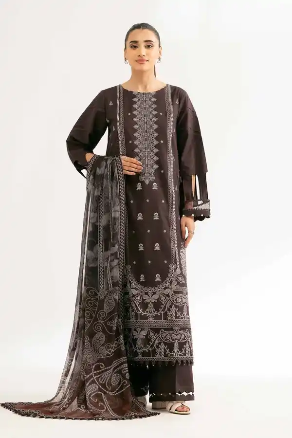 Brighten up your wardrobe with this embroidered printed 3-piece brown khaddar suit Rs:7,490 Rs:5,617 only.
