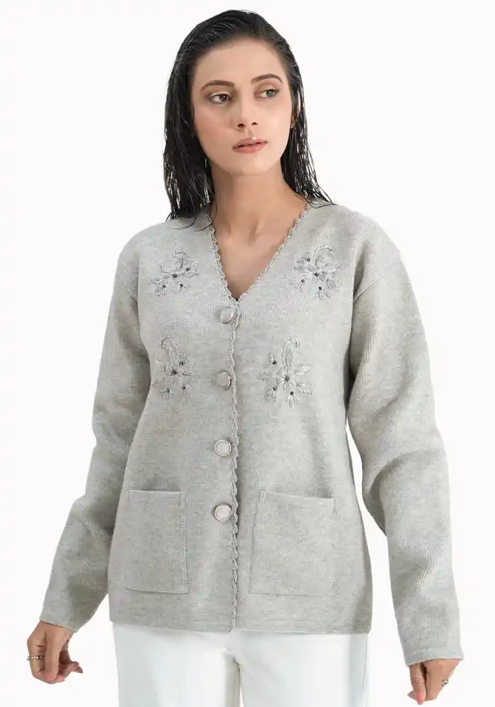 Grey color ladies winter wear cardigan available for Rs:8,950.