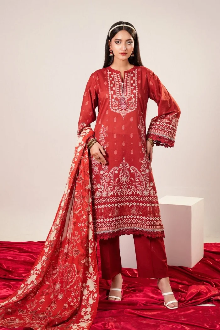 Red 3 piece printed lawn unstitched suit Rs.4,290 Rs 3,290 save 25% now.