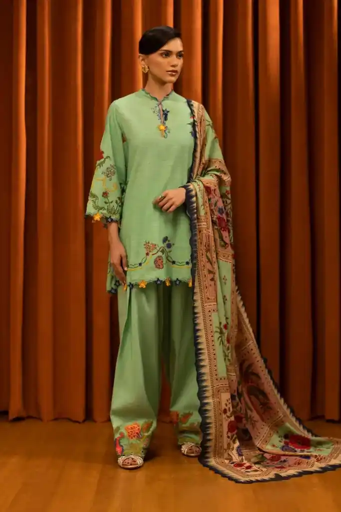 Beautiful green color 3piece suit with matching shawl and pants available for Rs:9,999Â only.