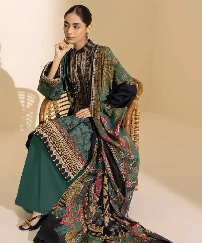For an elegant look digital printed dark green-color 3piece unstitched suit Rs:3,490 Rs:1,745.