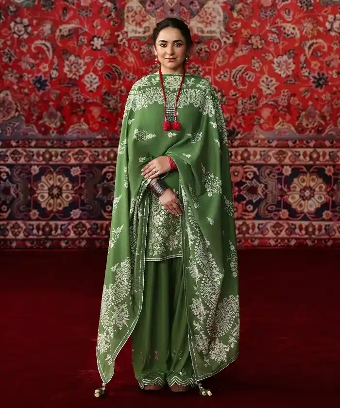Green color lawn 3 pc unstitched suit for women Rs:6,990.