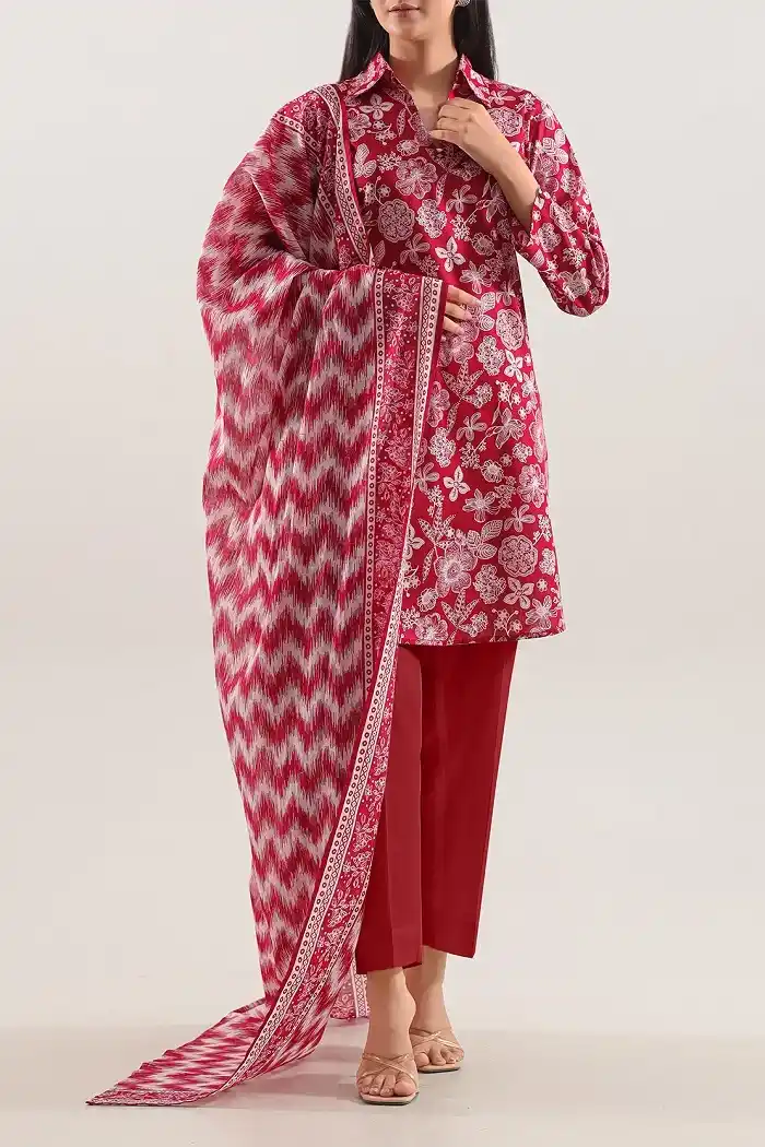 Unstitched printed lawn 3-piece red color suit Rs:2,999 Rs:2,599.