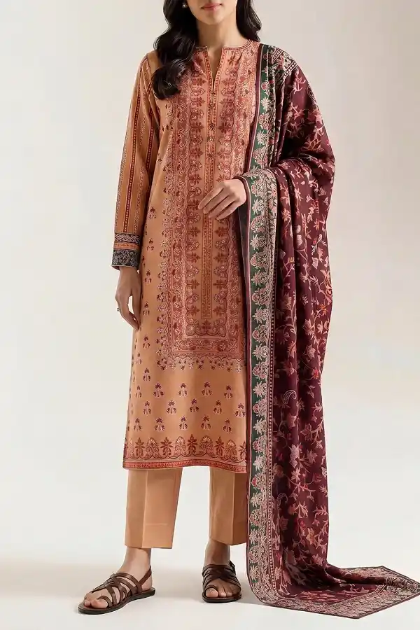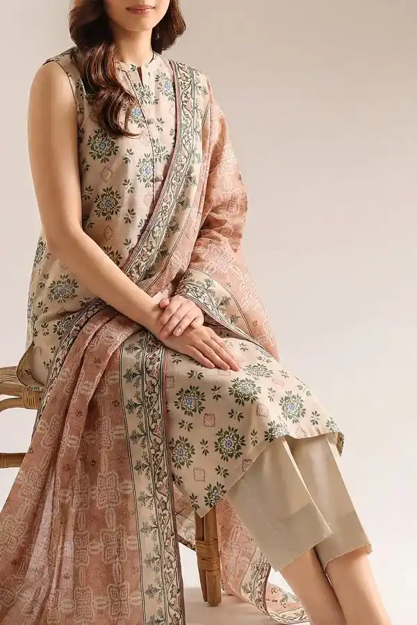Stylish digital printed lawn 3pc beige color unstitched suit PKR:2,999.