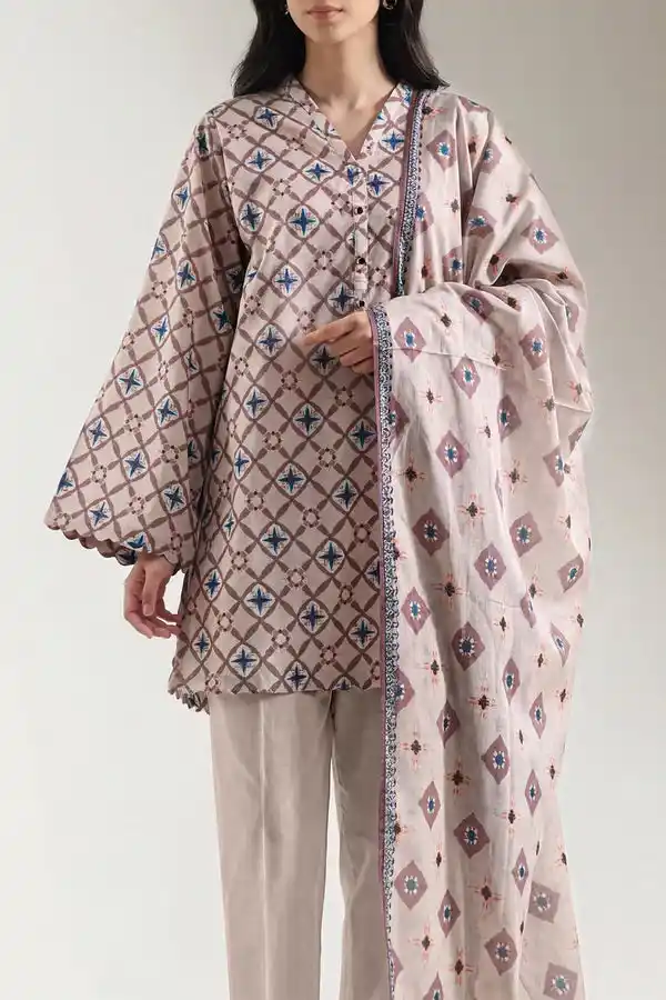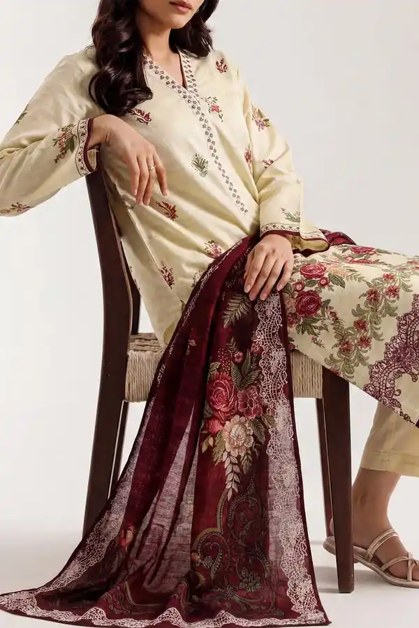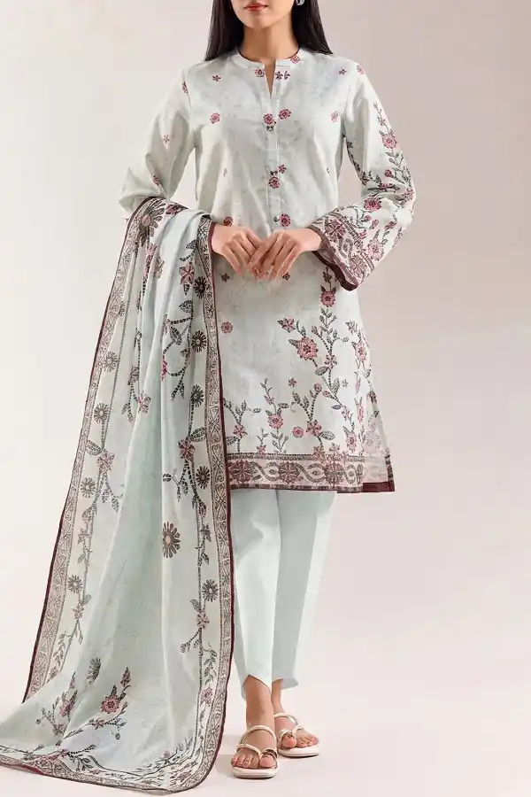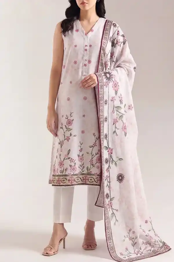 Transform your summer wardrobe with ivory color 3 piece printed lawn unstitched suit available for Rs:2,999.