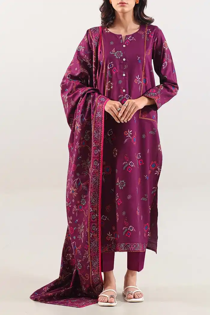 Beautiful mauve printed 3piece cotton khaddar suit for the winter season available Rs:2,999Â only.